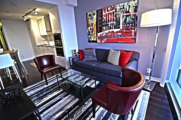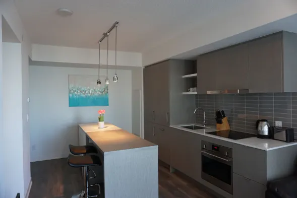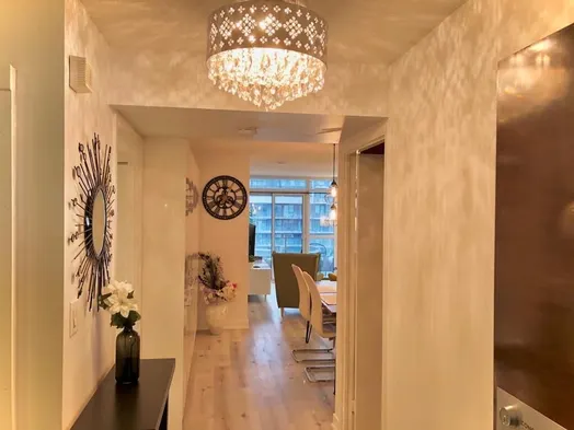 Individually decorated condo with a kitchen, private balcony, and fitness center in downtown Toronto.