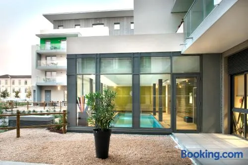 Aparthotel in the heart of Nîmes with sauna, fitness center, and modern kitchenettes for a comfortable stay.