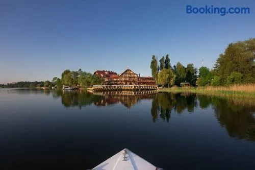 Luxury hotel on a lake with a spa, swimming pool, and two restaurants offering Polish cuisine. Enjoy stunning views and spacious rooms.