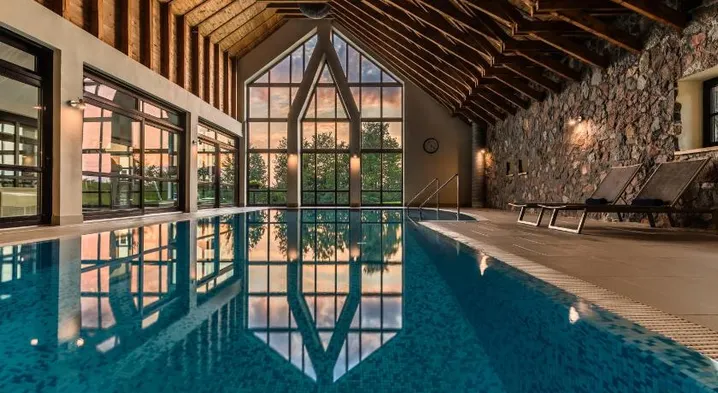 Luxury hotel on a lake with a spa, swimming pool, and two restaurants offering Polish cuisine. Enjoy stunning views and spacious rooms.