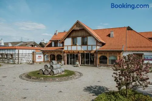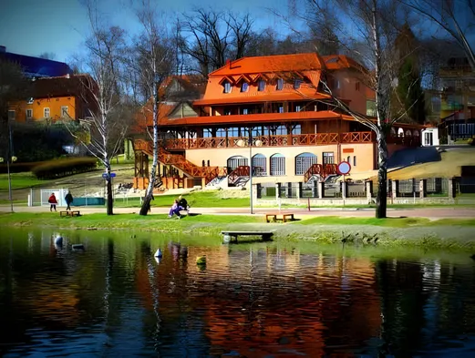 Luxury hotel on a lake with a spa, swimming pool, and two restaurants offering Polish cuisine. Enjoy stunning views and spacious rooms.