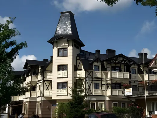 Luxury hotel with spa, two indoor swimming pools, and international dining near Kołobrzeg Beach.