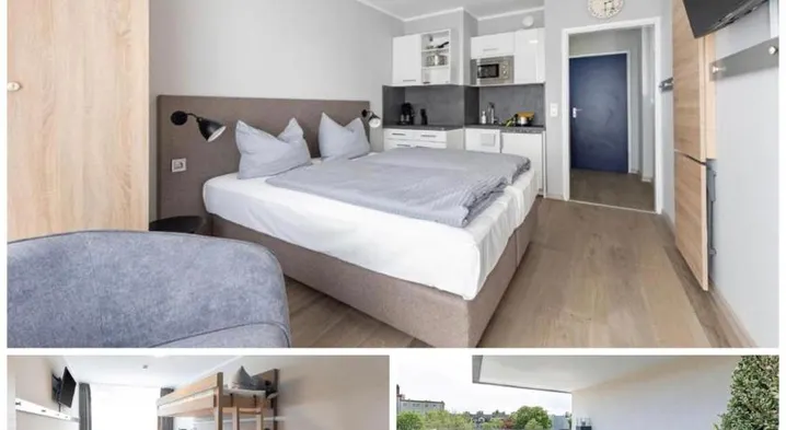Modern aparthotel with kitchenettes, private balconies, and a garden in Munich's Am Riesenfeld area.