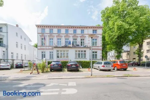Beach hotel with rooftop terrace, restaurant, and easy access to Warnemunde Beach and Lighthouse.
