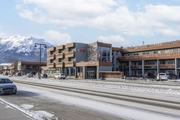 Centrally located hotel in Jasper with ski storage, dining options, and a hot tub for a relaxing stay.