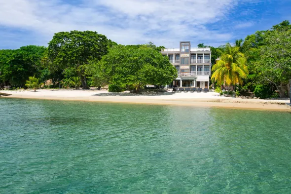 Beachfront apartment with private beach access, terrace views, and on-site dining in Roatan.