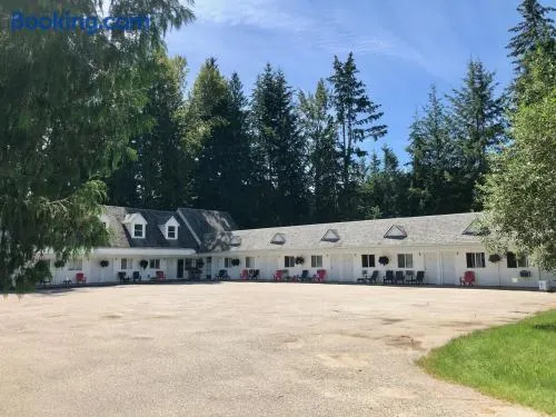 Enjoy a complimentary breakfast and relax in the garden at this hotel on the river in Sicamous.
