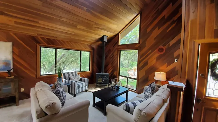 Modern-rustic vacation home with a fireplace, fully equipped kitchen, and access to hiking and the beautiful Kaweah River.