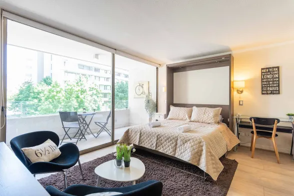 Luxury hotel in Santiago with a spa, outdoor pool, and international dining options, just steps from Casacostanera.