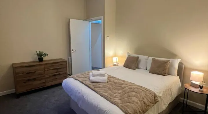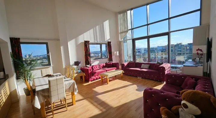 Spacious 2-bedroom apartment with terrace, free parking, and garden views in Edinburgh's Leith district.