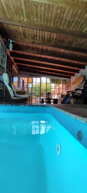 Three bedrooms, three bathrooms, and a large swimming pool and air conditioning.