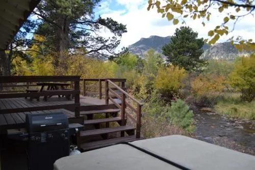 Cozy cabin on the riverwalk with hot tub, picnic area, and private balconies in Estes Park.