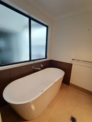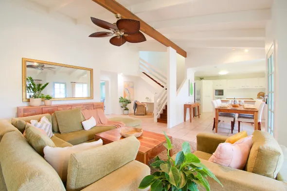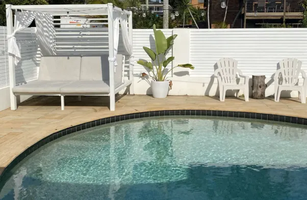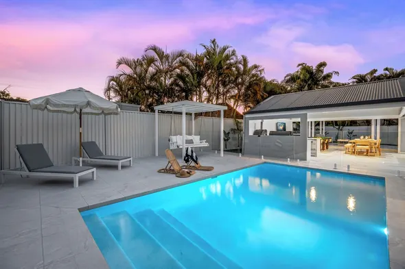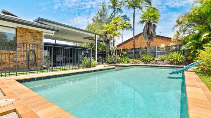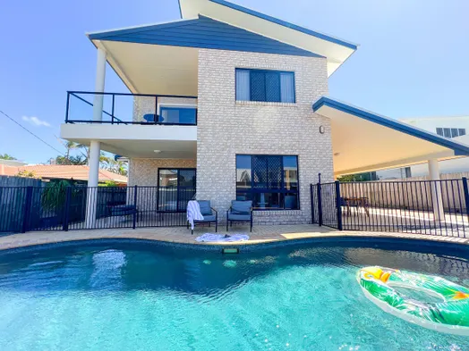Spacious vacation home with heated pool, luxury bathrooms, and pet-friendly large fenced yard near the beach.