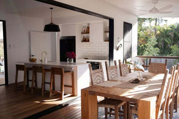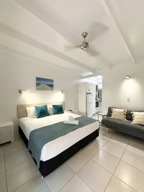 A typical hotel room with a kitchen near Magnetic Island is designed to maximize space and comfort. You'll usually find a combined living and dining area that features the kitchen appliances integrated into the layout. The kitchen often includes a kitchenette or a full kitchen setup with a dining table or bar seating nearby. The sleeping area may be separated by a visual barrier or an open-concept design. Overall, these rooms aim to provide a functional space that feels like home, catering to both relaxation and meal preparation.
