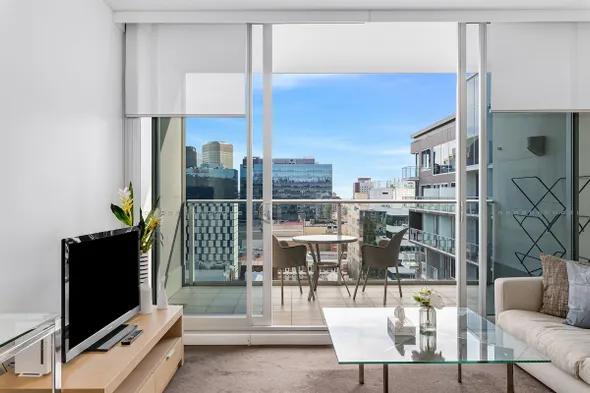 Luxury aparthotel with indoor pool, fitness center, and private balconies in the heart of Adelaide.