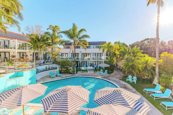 Mediterranean resort near Ettalong Beach with seasonal outdoor pool and 10 dining options.