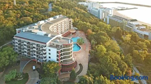 Family-friendly aparthotel with a seasonal outdoor pool and spa services, just 0.5 km from Golden Sands Beach.