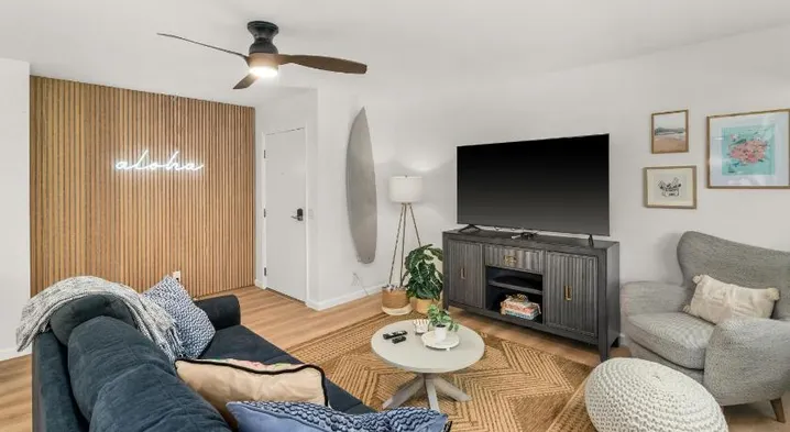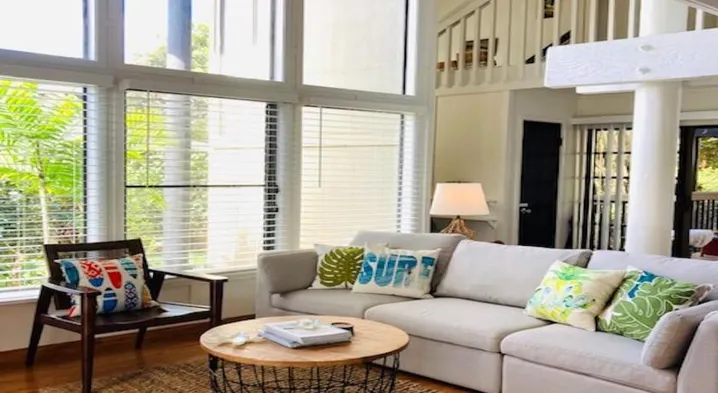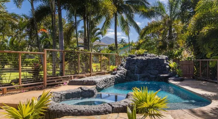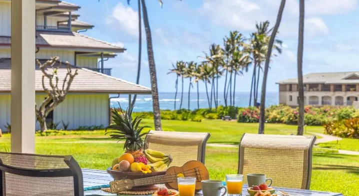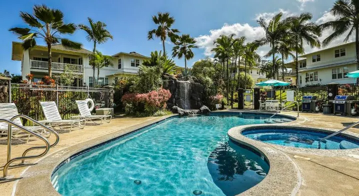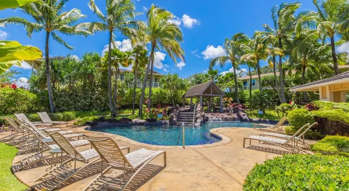 Upscale holiday home with a custom four-poster bed, access to a pool, and adults-only policy in Poipu, Hawaii.