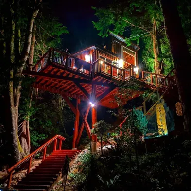 Experience a unique treehouse stay with stunning views, kitchenette, and cozy fireplace in the heart of Sooke's natural beauty.