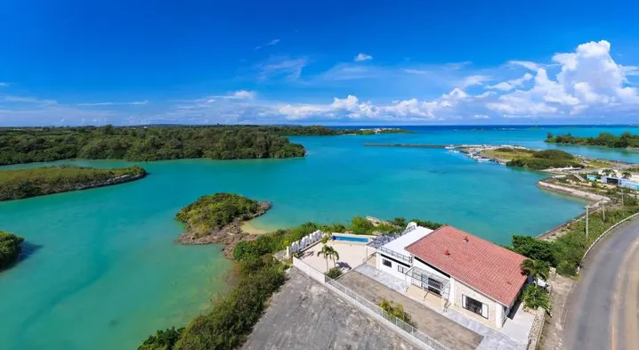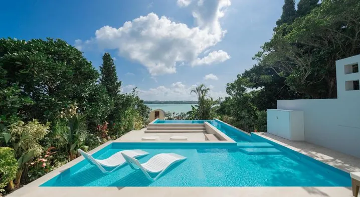 Luxury villa with outdoor pool, hot tub, sauna, and private terraces in Miyakojima.