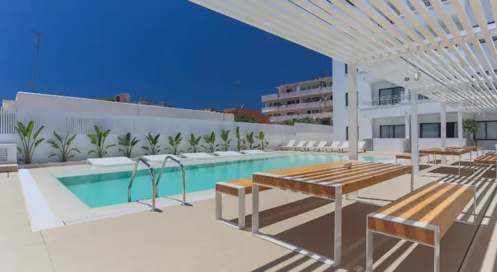 Aparthotel with swimming pool, on-site dining, and concierge service, just 100m from the beach in Ibiza.