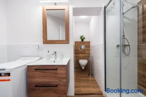 Modern apartment in Kraków with air conditioning, kitchenette, and convenient access to public transport and local attractions.