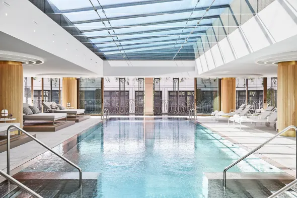 Luxury hotel in Madrid with spa, indoor pool, and fine dining near Puerta del Sol and Gran Via.