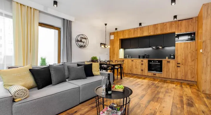 Stylish apartment in Gdynia with a fully equipped kitchen, balcony, and 24-hour front desk service.