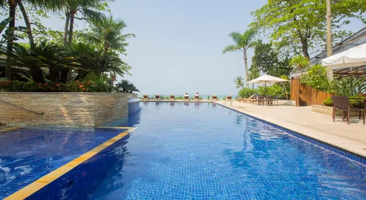 Beachfront hotel with outdoor pool, sauna, and fitness center, steps from Maresias Beach and Serra do Mar State Park.