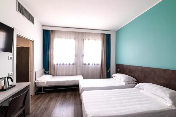 Modern hotel near Fiera Milano with fitness center, two restaurants, and spacious family rooms available.