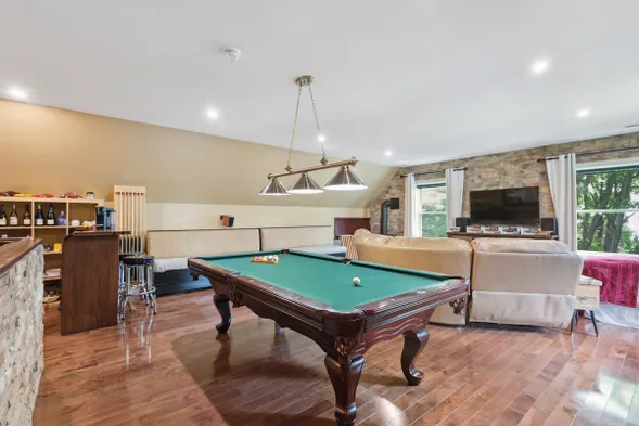 Loft with fireplace, pool table, home theater and more