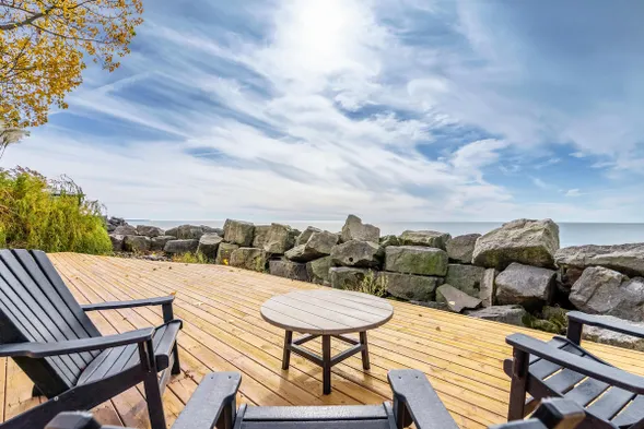 Beachfront hotel with a restaurant, featuring rooms with fireplaces and stunning views of Lake Erie.