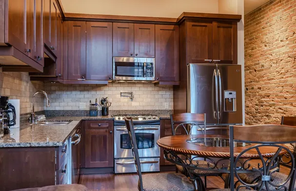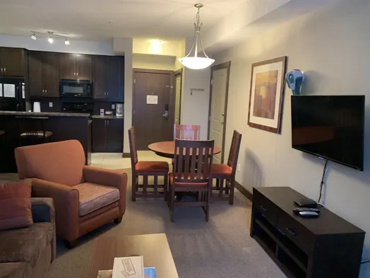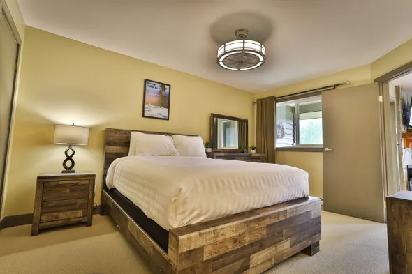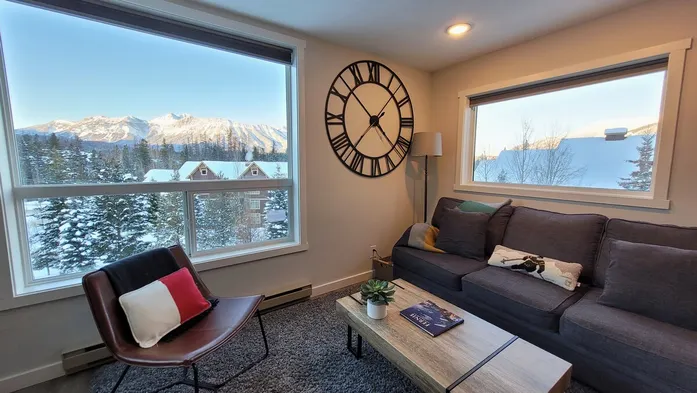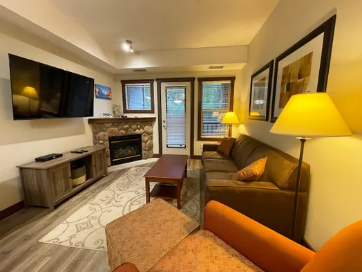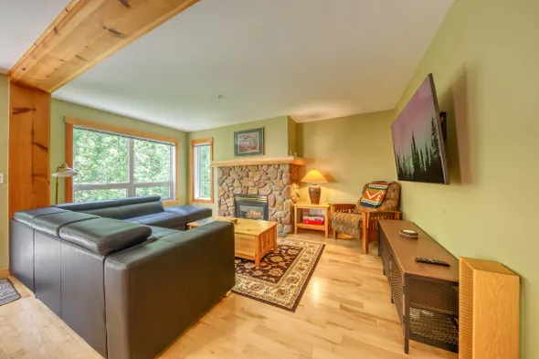 Cozy condo with a king bed, stone fireplace, and access to indoor pool, sauna, gym, and outdoor hot tub in Fernie.