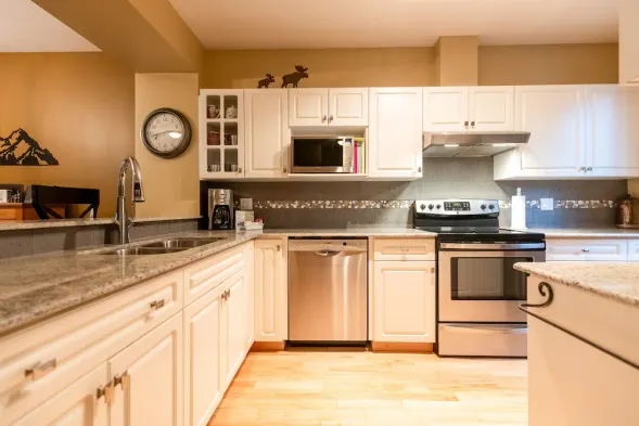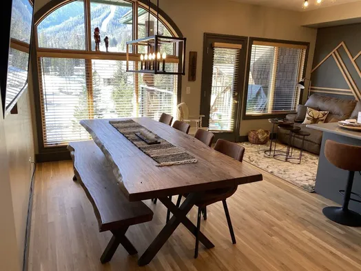 Cozy condo with a king bed, stone fireplace, and access to indoor pool, sauna, gym, and outdoor hot tub in Fernie.