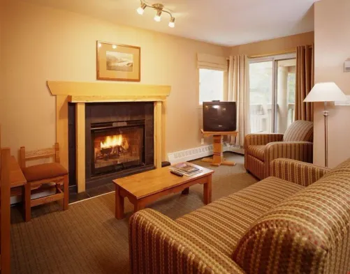 Cozy aparthotel in Banff with rooftop hot pools, luxury amenities, and a private balcony for stunning mountain views.