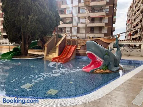 Family-friendly hotel in Calella with 2 outdoor swimming pools and a children's water park featuring 4 slides.