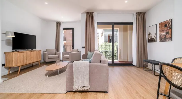 Aparthotel in L'Hospitalet de Llobregat with air-conditioned rooms, kitchen facilities, and a communal living room.
