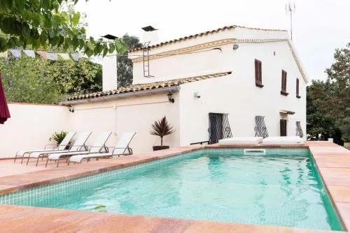 Charming chalet with private pool, outdoor terrace, and seasonal outdoor pool in scenic Teia, Spain.