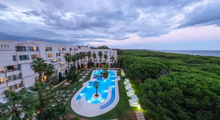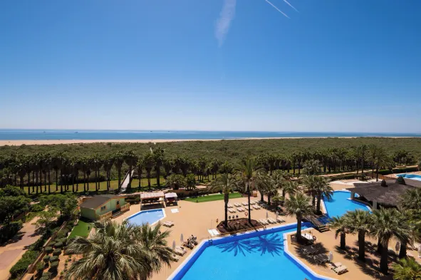 Experience beachfront luxury with a main pool, tropical gardens, and a variety of dining options in Isla Cristina.
