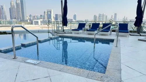 Enjoy a luxurious stay with an outdoor pool, sauna, and multiple dining options in Dubai Media City.