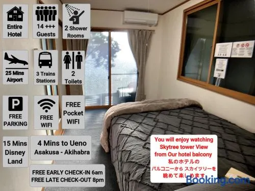 Entire Hotel Beside Asakusa, Ueno, Akihabara and Tokyo Skytree tower between 3 Train Stations and Contains 3 Bedrooms, 2 Bathrooms and 2 toilets for 14 guests