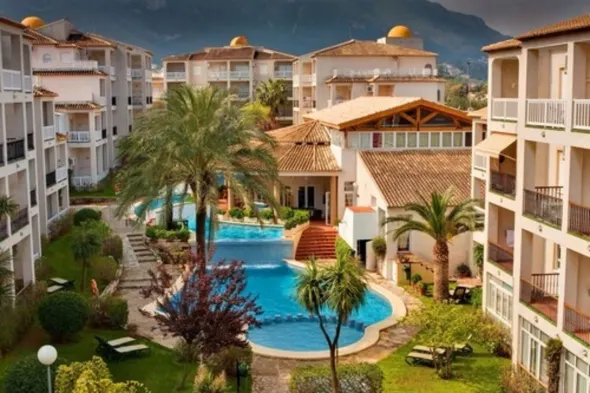 Aparthotel with indoor and outdoor pools, restaurant, and garden, located near La Marineta Cassiana in Denia.