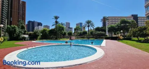 Luxurious apartment with mountain views, swimming pool, and terrace in Benidorm, perfect for families and groups.