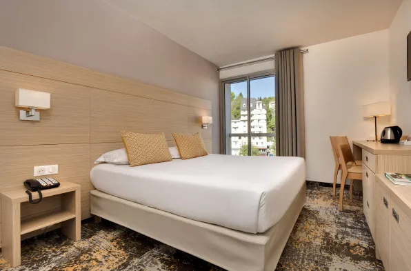 Comfortable hotel in the heart of Lourdes with convenient amenities and a restaurant, just a short walk from local attractions.