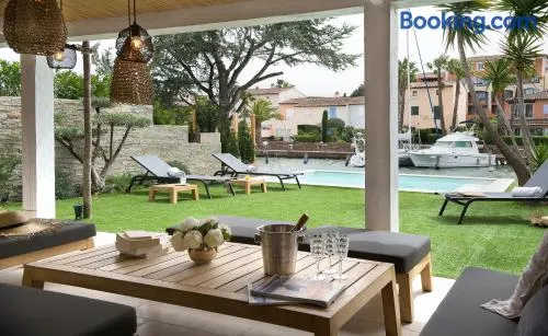 Family-friendly aparthotel with swimming pool, private beach access, and nearby golf course in Grimaud, France.