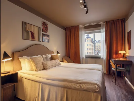 Stay in a stylish hotel with a sauna, fitness center, and two restaurants in central Stockholm.