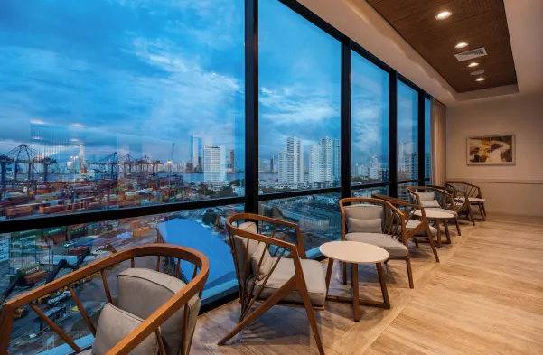 Enjoy panoramic Caribbean views from the outdoor pool at this modern hotel in Bocagrande, Cartagena, with free WiFi and dining options.