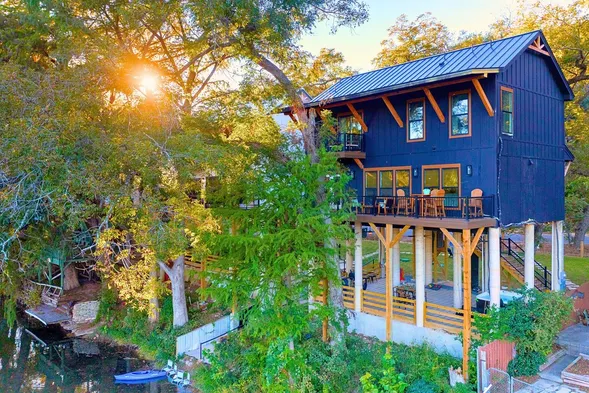The iconic Black House on the Guadalupe. Flowing Waters Retreat: luxe riverfront living with a private hot tub, kayaks & stunning views. Modern design meets professional management for a hassle-free stay. Your luxury river escape starts here!