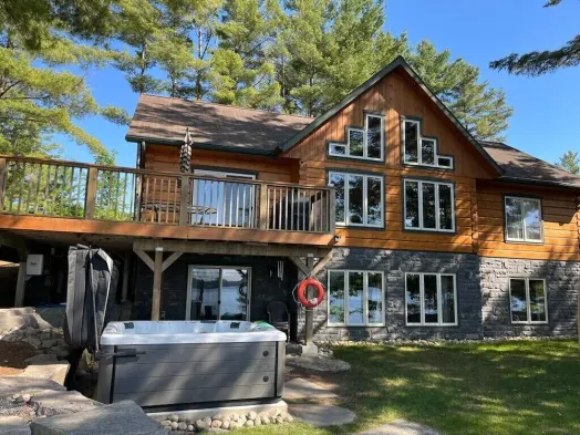 200 ft Private Muskoka waterfront custom log home with Hot Tub!!