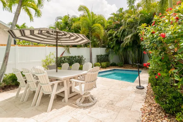 Newly remodeled vacation home with heated pool, en-suite baths, and steps from Siesta Key beach. Adults only.